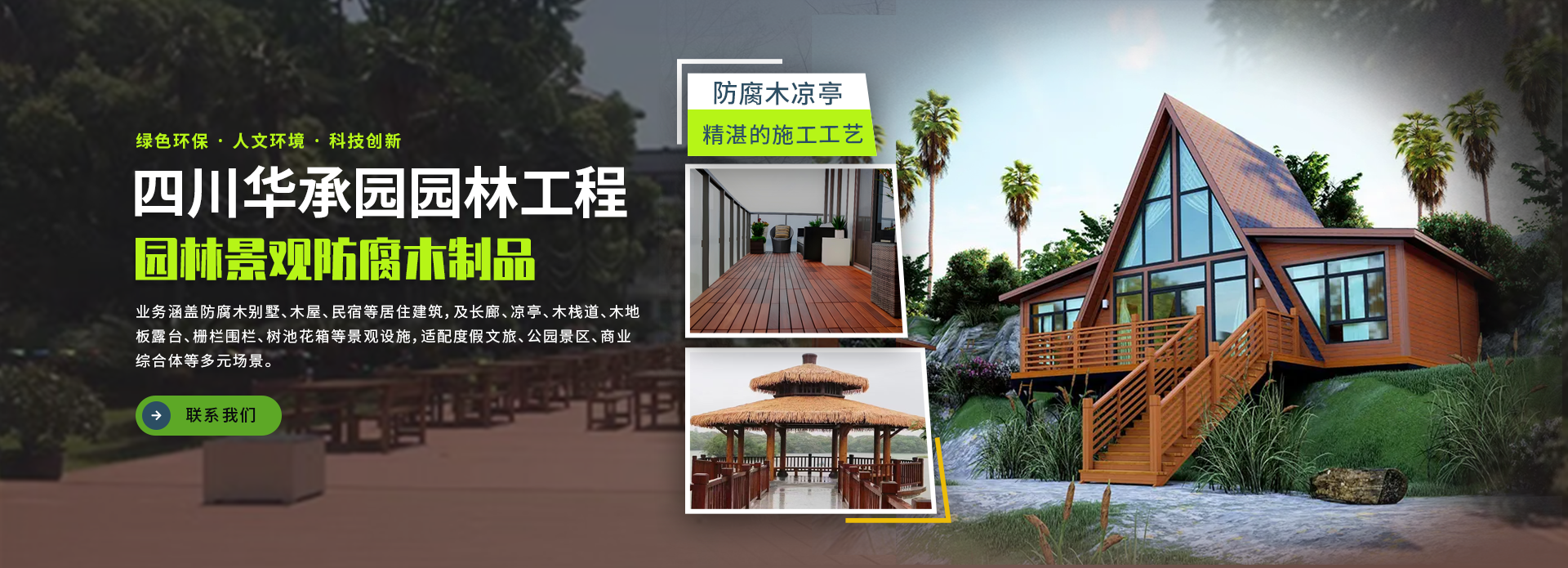 四川華承園園林工程有限公司,專注防腐木建筑及景觀設施的設計、生產與施工,是集定制、銷售、安裝、維護于一體的全產業鏈服務商,輻射川渝及全國市場,力爭于于打造綠色戶外空間。?    業務涵蓋防腐木別墅、木屋、民宿等居住建筑,及長廊、涼亭、木棧道、木地板露臺、柵欄圍欄、樹池花箱等景觀設施,適配度假文旅、公園景區、商業綜合體等多元場景。?    采用進口松木與環保銅唑防腐劑,經真空加壓工藝處理,抗腐防蟻性能佳,提供 20 年結構質保。團隊提供定制設計、標準化施工及年度維護服務,自有施工團隊保障效率與質量。?    獲 “綠色建材推薦品牌” 等認證,標桿案例包括重慶仙女山木屋度假區(200 + 棟別墅集群)、成都天府綠道木棧道、大理高端民宿景觀系統等。?    我們以 “雙碳” 戰略為導向,力爭成為西南地區精研的生態建筑服務商,讓木材煥發自然生命力。